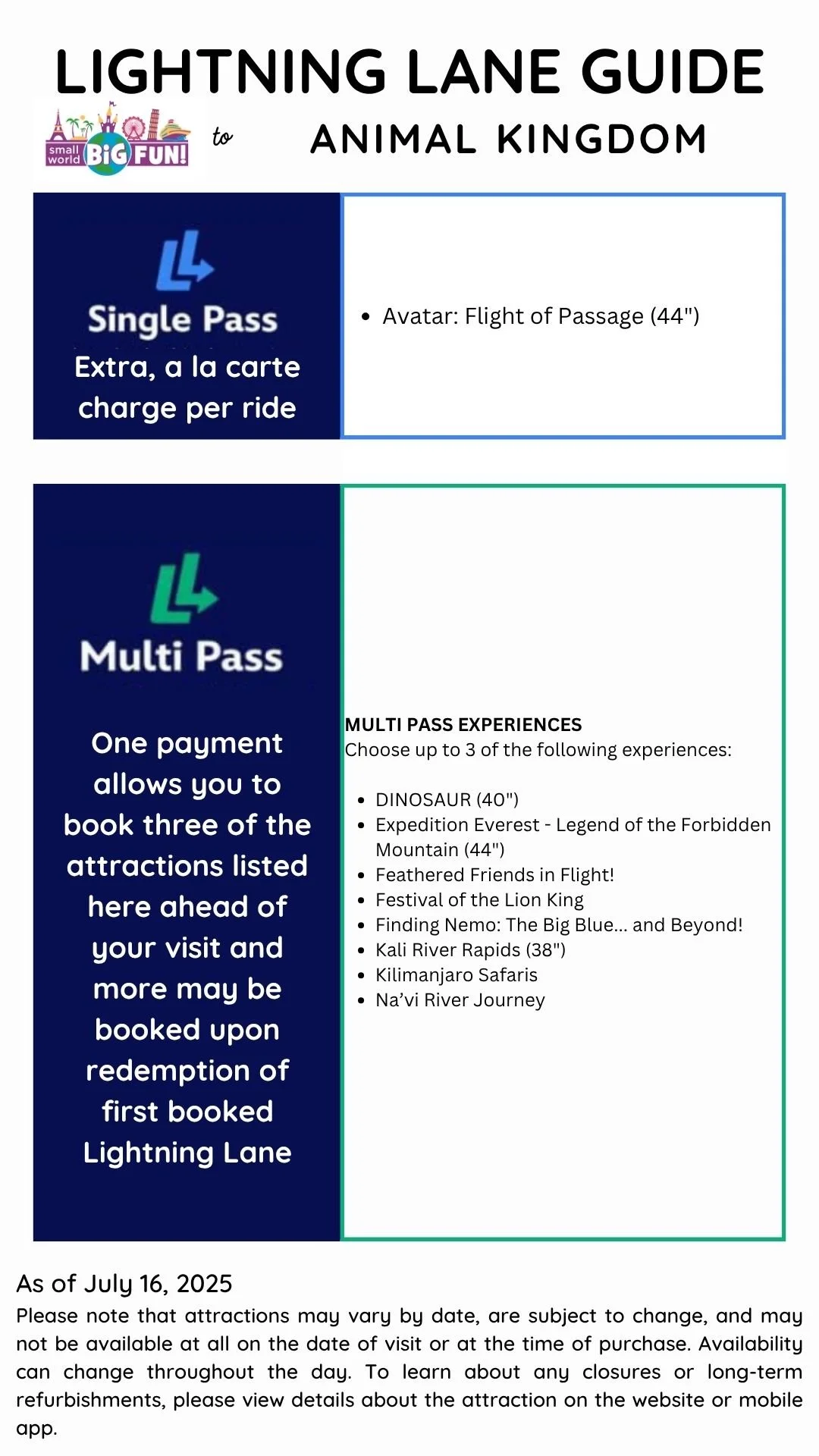 2) Know which attractions are included with Multi Pass and which ride is this park’s Single Pass (aka “Fancy Ride” not included in Multi Pass purchase). I’ve listed them for you below.